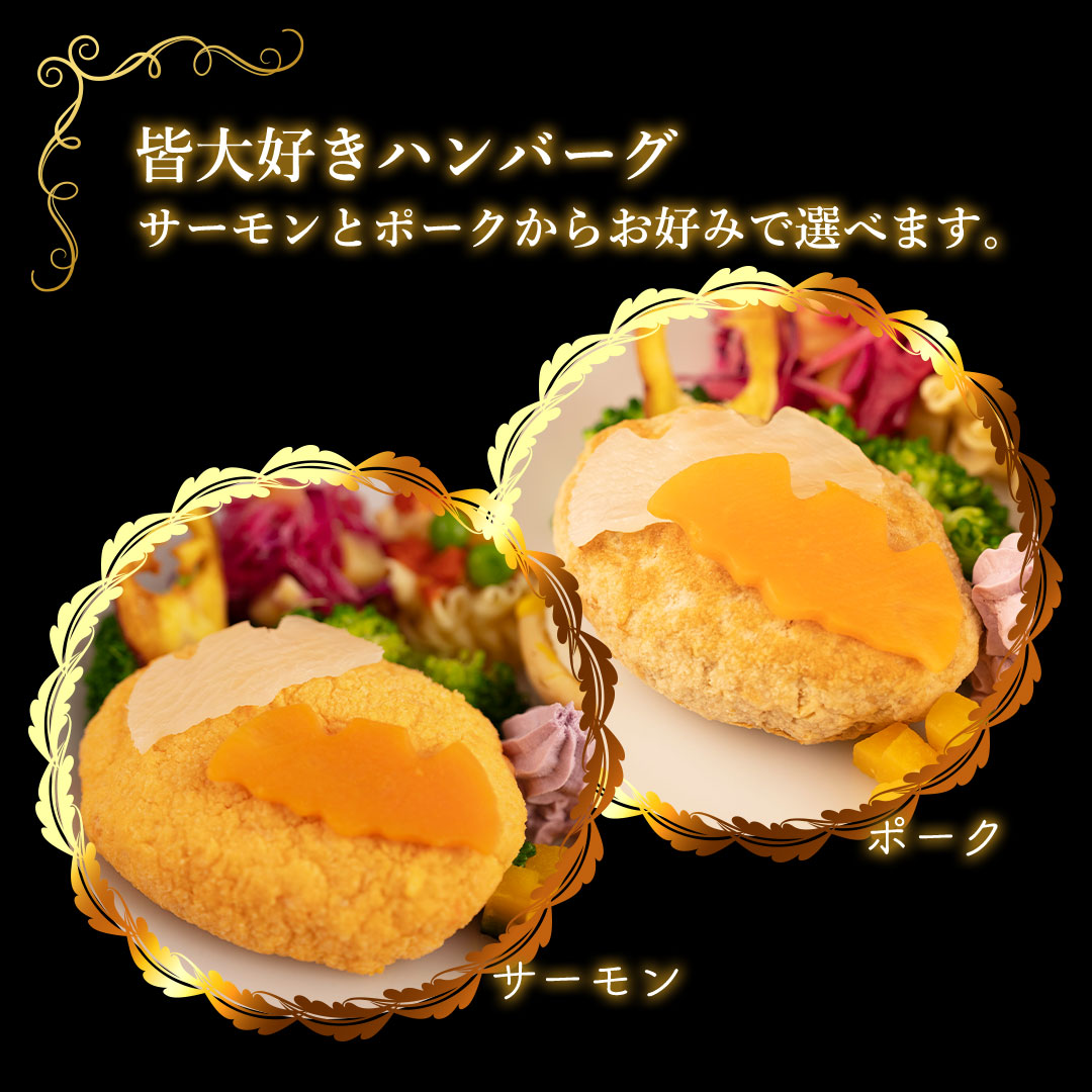 ハンバーグはサーモンとポークの2種類からお選びいただけます。