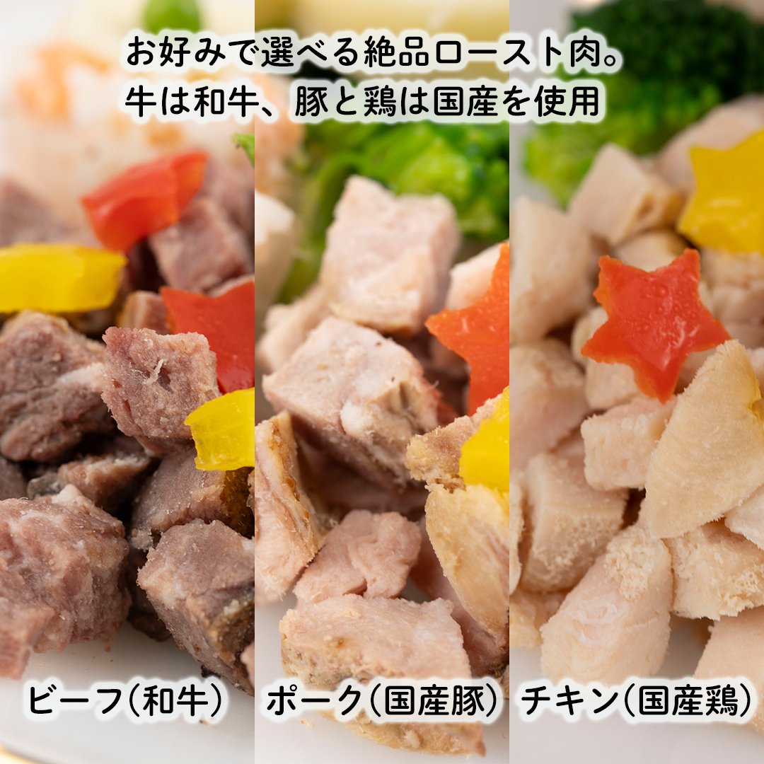メインのお肉はローストビーフ・ローストポーク・ローストチキンからお選びいただけます。